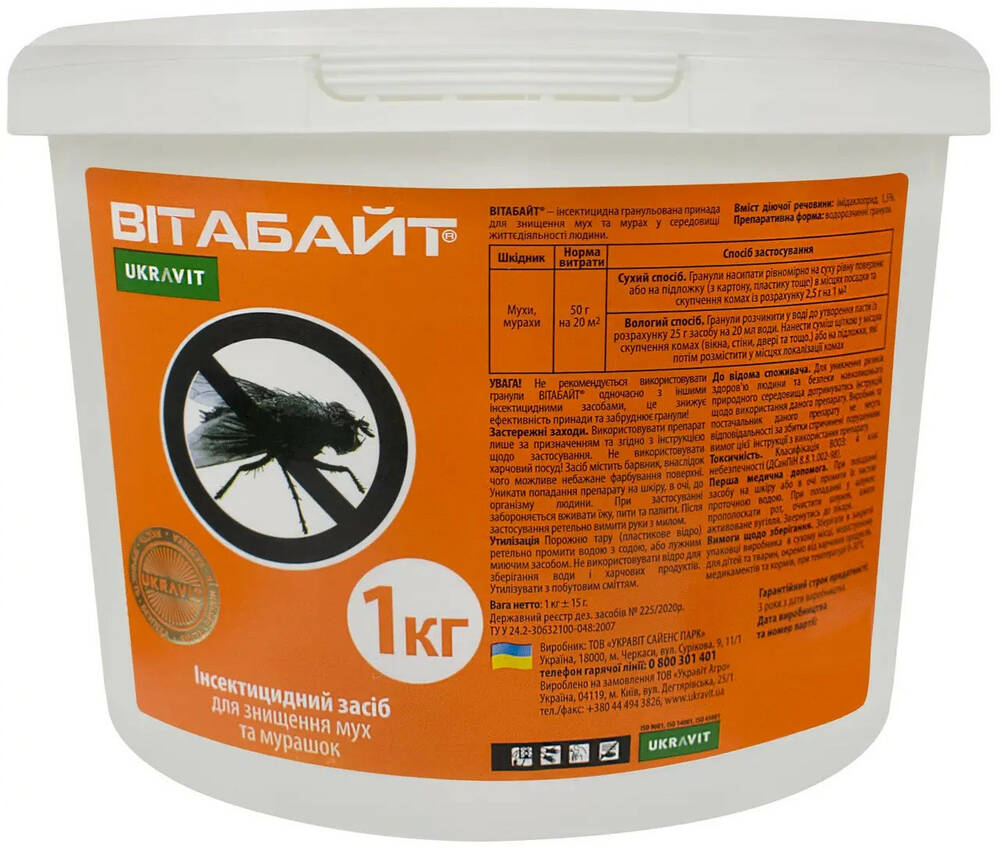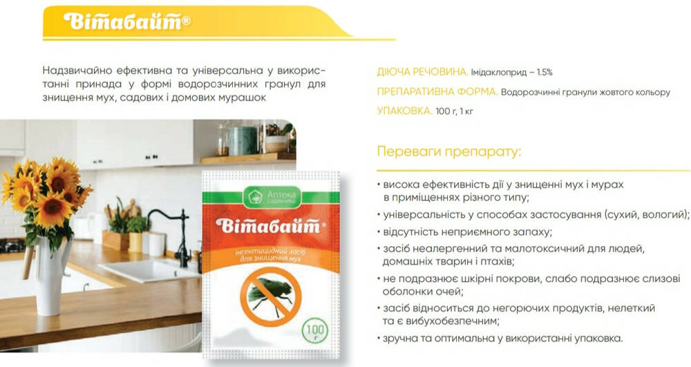 Витабайт - Чрезвычайно эффективная и универсальная в использовании приманка в форме водорастворимых гранул для уничтожения мух, садовых и домовых муравьев.