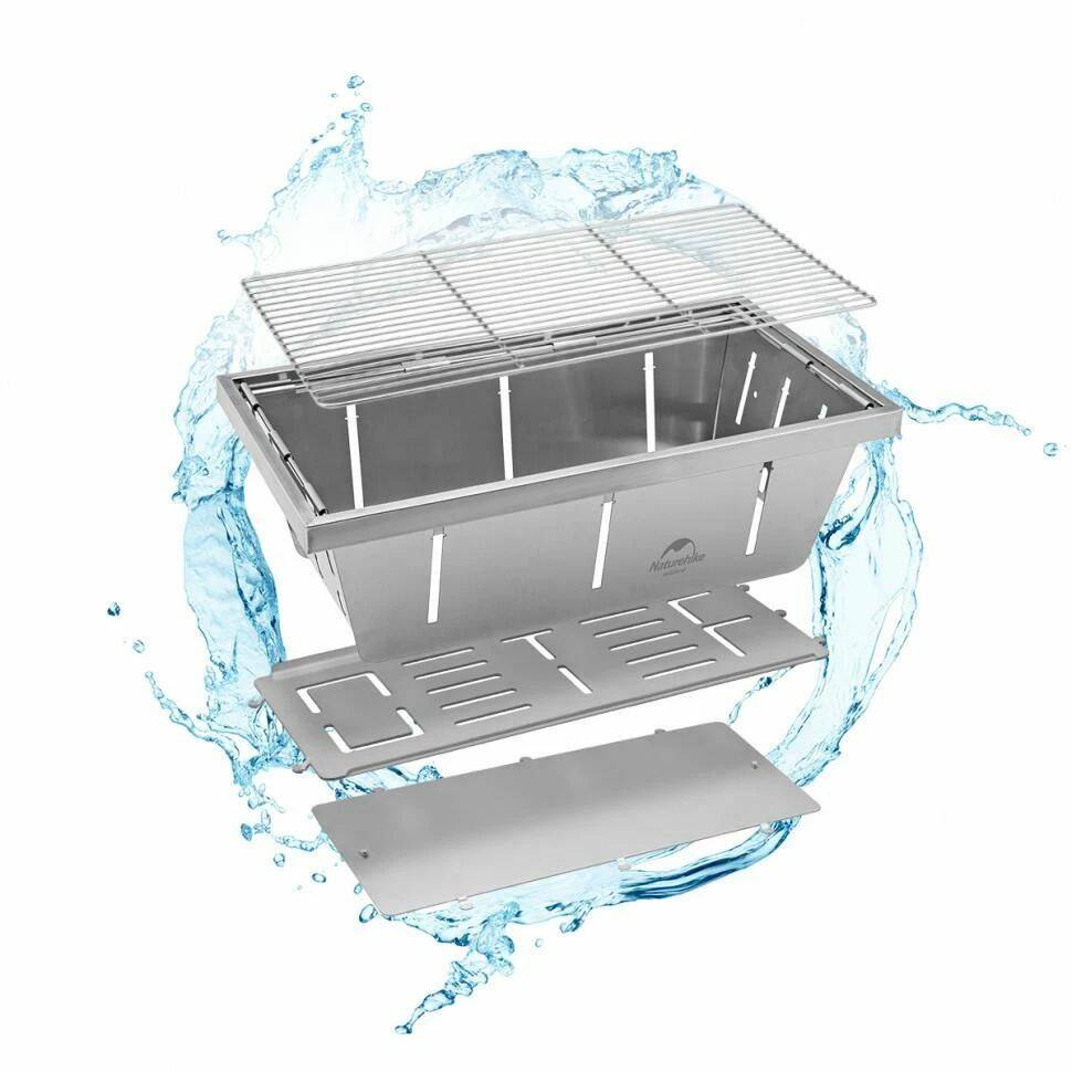 Портативний гриль сталевий. В основі виробу — матова нержавіюча сталь. Ультратонкий корпус, сітка для гриля для харчових продуктів. При виготовленні моделі використовували захищену від корозії сталь марки 304, а також стійку до іржі сталь марки 201. Вага виробу досягає 4.95 кілограма. Габарити складових частин гриля: 50x36x14 см / 33,5x23 см. Габарити сумки для зберігання: 25 x 36 см.