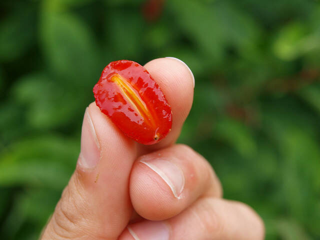 Плоди: Кущі гумі дають рясні врожаї з липня до серпня. Перше плодоношення чагарник може давати на 3-4-й рік. Плоди зовні нагадують кизил - подовжені або овальні до 2см довжиною і близько 1 см в діаметрі, масою 1,5-2г, на довгих плодоніжках, червоного кольору, густо усіяні сріблясто-білими точками. Мають ароматну соковиту м'якоть солодко-кислого незвичайного смаку з легкою терпкістю - нагадують яблуко, виноград, вишню і ананас разом узяті. Володіють багатим хімічним складом і лікувальними властивостями. Всього в плодах гумі виявлено 17 амінокислот, а вміст вітаміну С, навіть більше, ніж в цитрусових. Плоди можна вживати свіжими, заморожувати, сушити і використовувати в відварах, настоях, а також з них можна приготувати чудові варення, желе, компоти, соки, кисло солодкі соуси до м'яса, і навіть міцні приємні вина.