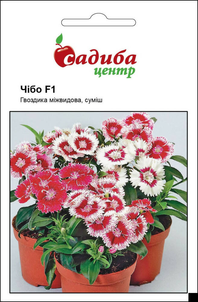 Гвоздика Чібо F1 - гвоздика міжвидова низькоросла, однорічна. Ці гібриди найбільш компактні, порівняно з іншими видами серії. Вони не потребують застосування регуляторів росту. Висота компактного куща в саду 30-35 см, у горщику 20-25 см, а ширина 20-25 см. Квітки з мережевними краями 3 см в діаметрі. Насіння висівають в квітні-травні. Для цього на поверхню добре зволоженого пухкого грунту викладають насіння. Паростки з'являються на 3-4 -й день. У відкритий грунт розсаду висаджують в травні - червні з грудкою землі. Зацвітає дуже рано, утворюючи розлогий кущ з поодинокими великими квітами. Невибаглива, посухо-і морозостійка рослина, однаково добре розвиваються на яскравому сонці і в тіні. Використовують для вирощування в горщиках, контейнерах, для масових посадок в міському озелененні, в композиціях з іншими квітами.