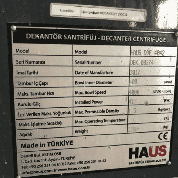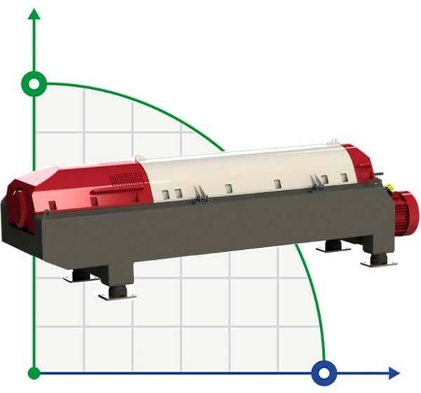 Декантерна центрифуга DDE спеціально розроблена для промислових заводів. Центрифуга представляє собою циліндричну чашу, яка обертається з великою швидкістю, а спіраль всередині корпусу обертається по тій самій осі, але з іншою швидкістю, що забезпечує поділ на тверду і рідку фазу. Сировина надходить в барабан через завантажувальний отвір і потім плавно розганяється ротором. В результаті обертання виникає відцентрова сила, яка змушує тверді частинки осідати на стінках барабана. В результаті тверді частки переміщаються за допомогою шнека в конічну частину барабана. Всі деталі, що контактують з продуктом, виконані з нержавіючої сталі.