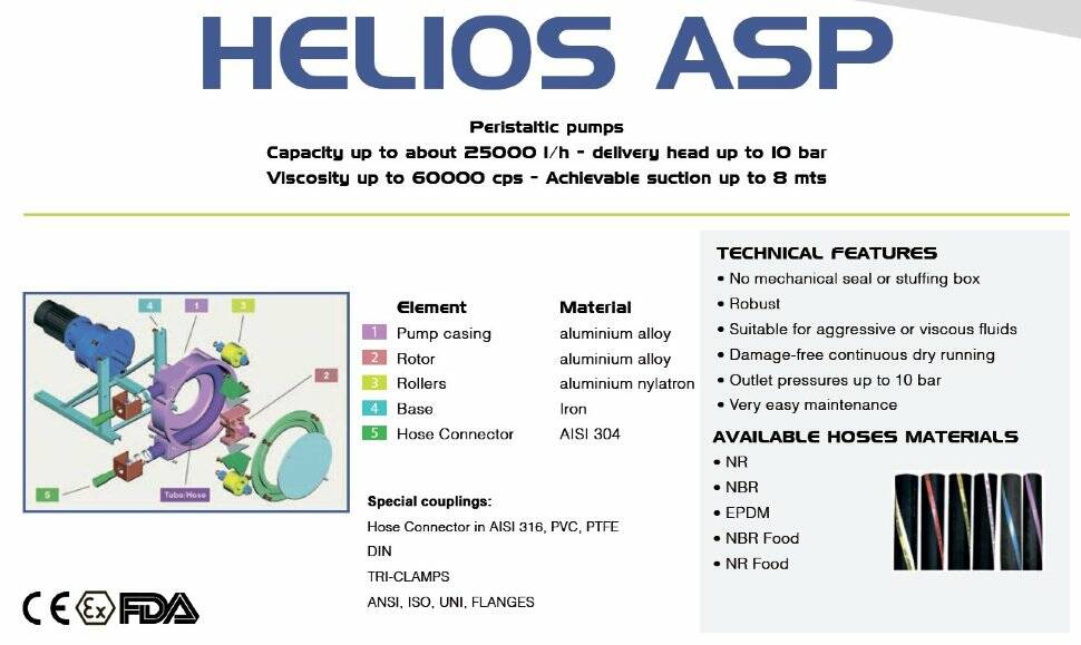 Перистальтичні насоси серії HELIOS ASP італійської компанії FLUIMAC застосовується для точного дозування абразивних продуктів, кислот, в'язких і щільних рідин. Перистальтичні насоси мають тривалий термін служби і підвищену надійність. Працюють в режимі самовсмоктування. Безперервна робота в сухому режимі. Швидке і просте технічне обслуговування.
