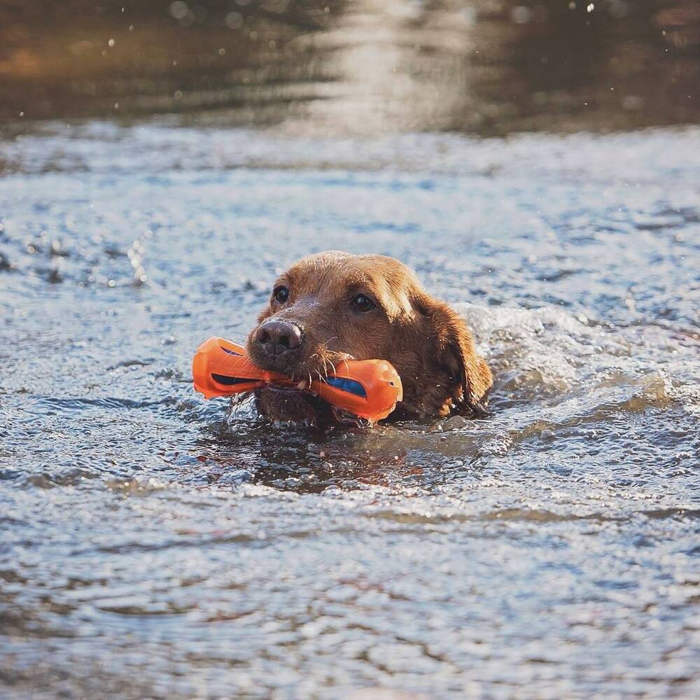 Ця іграшка з міцної гуми з м’яким внутрішнім шаром, що всмоктує воду. Яскраво-помаранчевий колір забезпечує високу видимість на воді або на суші.