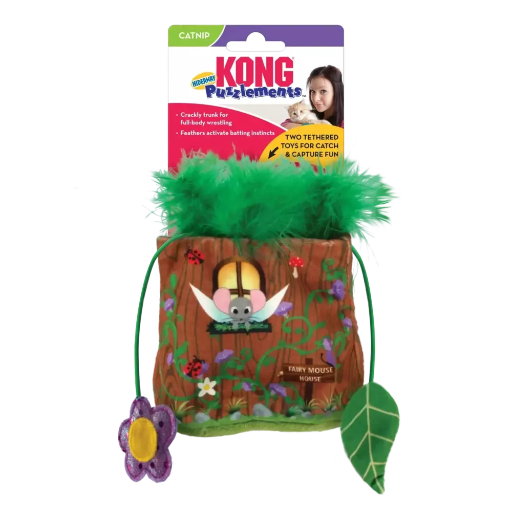 KONG Puzzlements Hideaway містить дві прив’язані іграшки, які задовольняють природні інстинкти котів досліджувати, полювати та ловити, одночасно забезпечуючи активне розумове та фізичне збагачення. Стовбур дерева, що тріщить, викликає інтерес у котів, а верхівка з пір’я спонукає до дослідження. Іграшки KONG North American Premium Catnip з блискучим листям і квітами, створені для веселощів та гри.