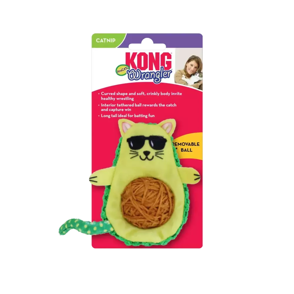 KONG Wrangler AvoCATo втамовує жагу котів до боротьби за допомогою вигнутої форми та м’якого зморшкуватого тіла, яке запрошує до здорової боротьби. Легкий, прив’язаний м’яч із пряжі викликає задоволення від ударів із непостійним підстрибуванням і брязканням, які винагороджують природні інстинкти. Довгий хвіст запрошує піймати та ловити, а KONG Premium North American Catnip забезпечує довгу, стимулюючу фієсту веселощів.