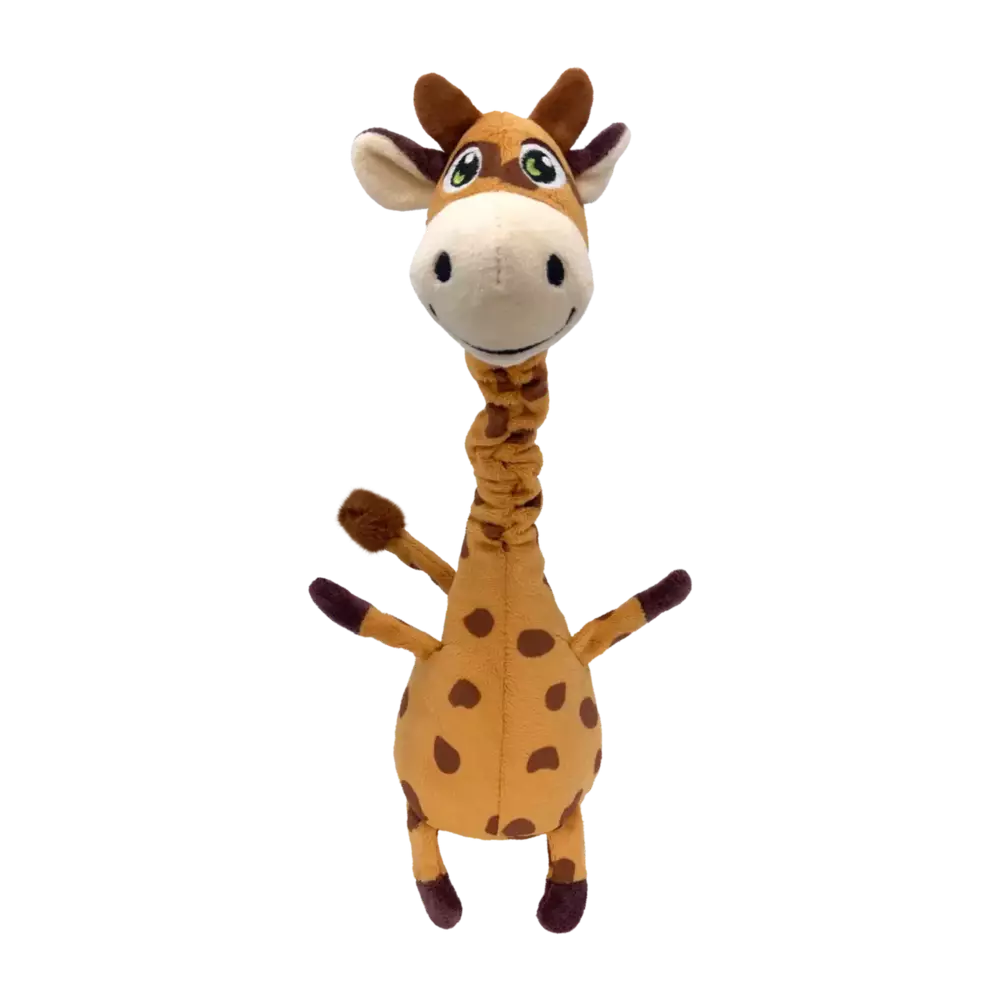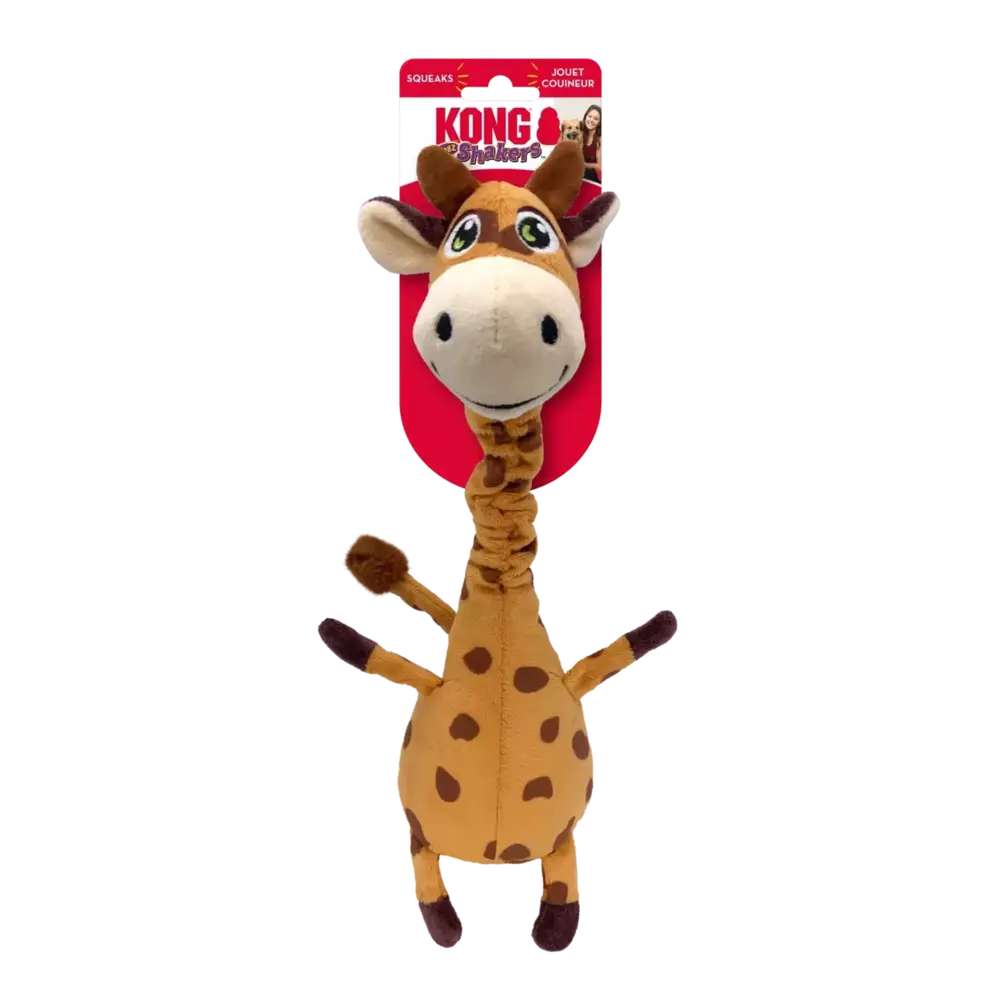 У KONG Shakers Bobz Giraffe є міцний, гнучкий шнур на його хиткій шиї, який дає змогу йому кивати, запрошуючи бити його довге, гнучке тіло. Низькотональний писклявий звук подовжує час гри, а шар армування подовжує задоволення від смикання, несення і кидання.