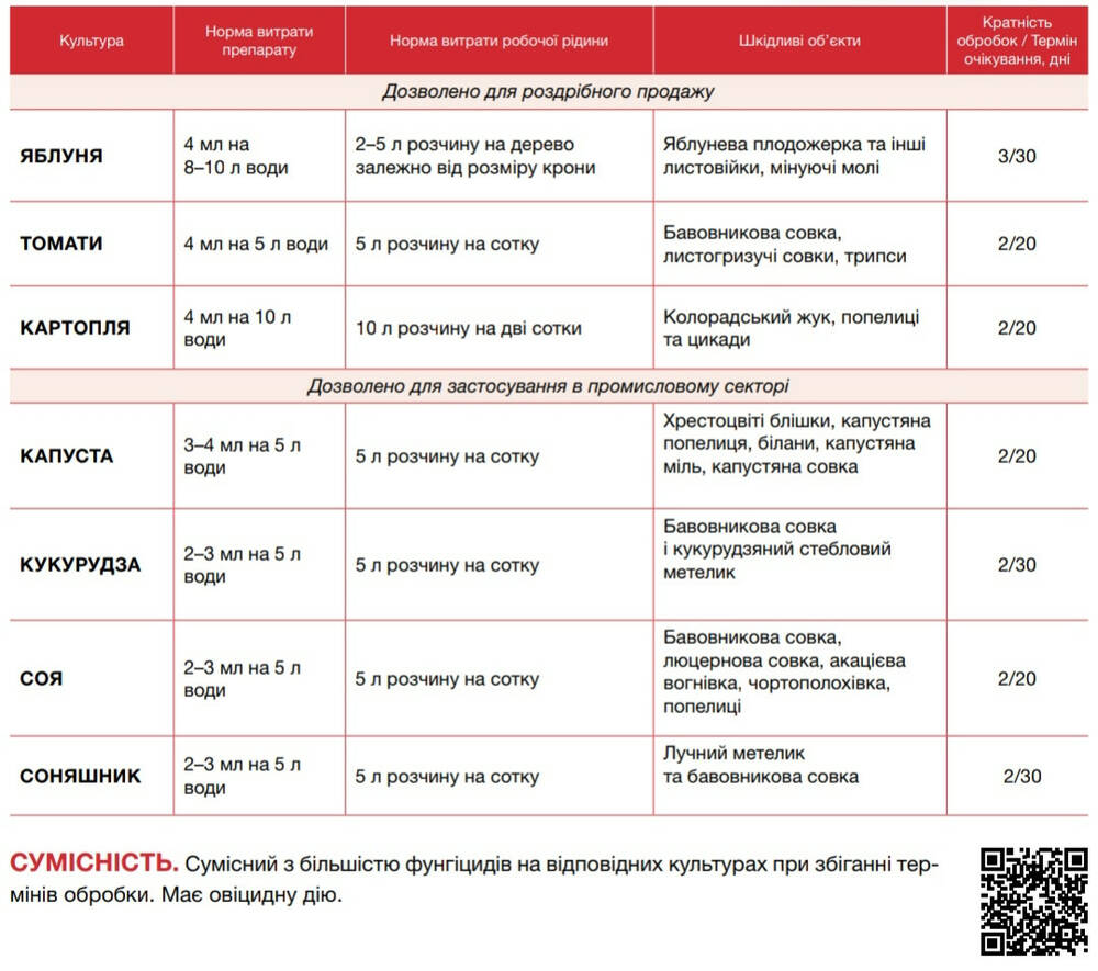 Яблоня 4 мл на 8–10 л воды 2-5 л раствора на дерево в зависимости от размера кроны Яблоневая плодожорка и другие листовертки, минирующие моли 3/30