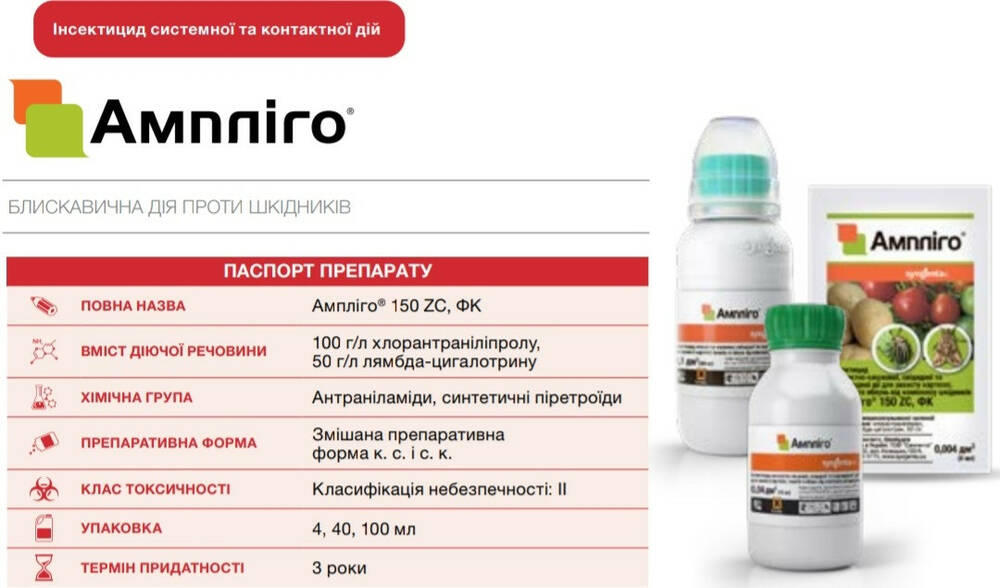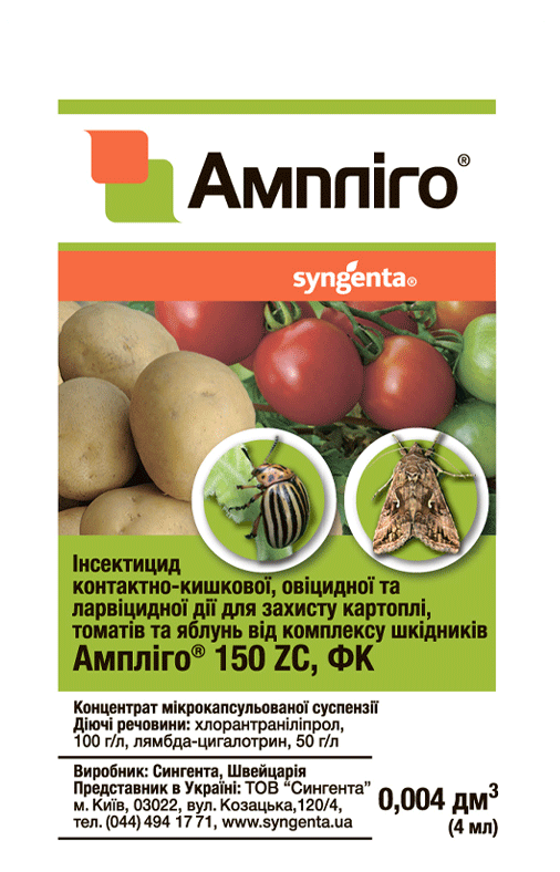 Амплиго - Новый инсектицид контактно-кишечного действия с широким спектром действия, содержит два действующих вещества. Действующие вещества имеют два разных механизма работы: блокирование центральной нервной системы и блокирование работы мышц вредителя. Сочетание этих веществ производит на вредителей мощное стартовое действие (нокдаун-эффект) и высокую эффективность в течение всего периода действия препарата.