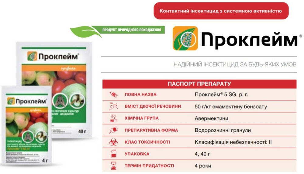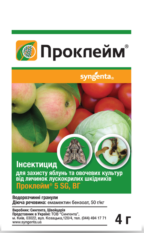 Проклейм - Новый инсектицид для защиты яблонь, овощных культур и винограда от всех чешуекрылых вредителей. Препарат быстро проникает в ткани растений (в течение 2 часов), но не имеет системного действия. Там он содержится в виде микрорезервуаров в большом количестве. Благодаря быстрому проникновению в растения эффективность действия препарата не зависит от высоких температур и осадков. Защитный период - до 2 недель. Действие препарата начинается с фазы яйца - прямое овицидное действие (при попадании на яйцекладку проникает через оболочку яйца и личинка погибает). В дальнейшем гибель личинок вредителей вызывает их питания на обработанных растениях (питание прекращается через 1-4 часа, полная гибель наступает в течение 1-4 суток).