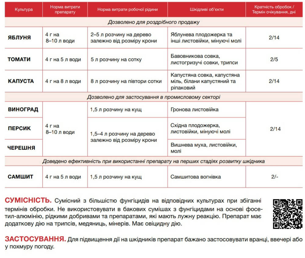 | Яблоня | 4 г на 8-10 л воды | 2-5 л раствора на дерево в зависимости от размера кроны | Яблоневая плодожорка и другие листовертки, минирующие моли | 2/14 |
