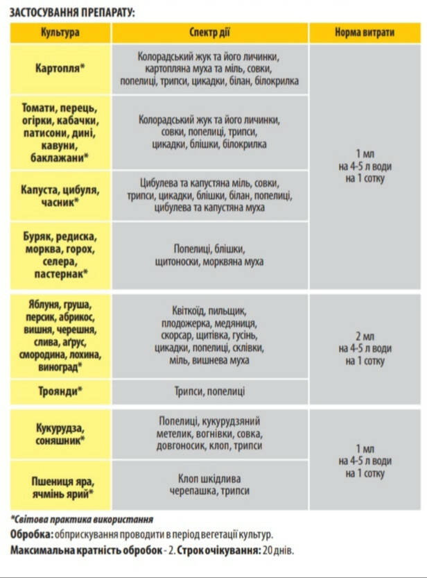 Яблоня, груша, персик, абрикос, вишня, черешня, слива, крыжовник, смородина, голубика, виноград Цветоед, пилильщик, плодожорка, медяница, скорсар, щитовка, гусеница, цикадки, тля, стекляшки, моль, вишневая муха 2 мл на 4-5 л воды на 1 сотку
