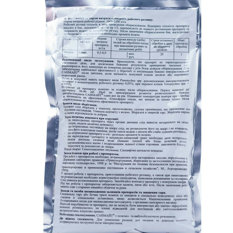 Найкраще використовувати Санмайт після цвітіння, коли щільність популяції кліщів досягає або перевищує пороговий рівень.