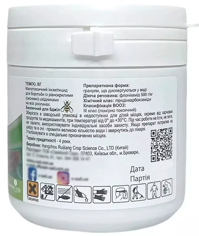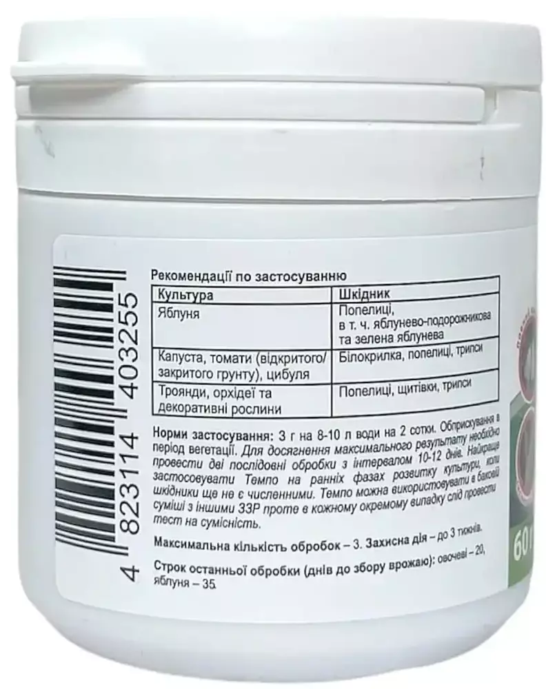 Темпо – це ідеальне рішення для професійного та аматорського використання, яке забезпечує надійний захист рослин від рівнокрилих (сисних) шкідників за умов дотримання рекомендацій.