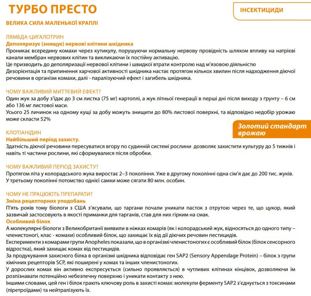 Турбо Престо - Новейший системный инсектицид для долговременной защиты всех культур, имеет нокаутирующее действие против широкого спектра вредителей, включая некоторые виды клещей.