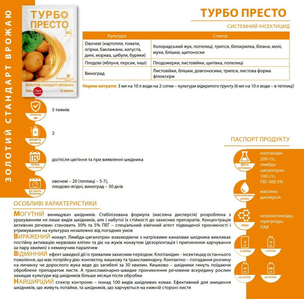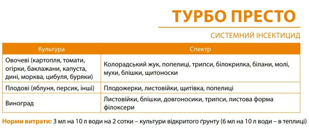Турбо Престо - Новейший системный инсектицид для долговременной защиты всех культур, имеет нокаутирующее действие против широкого спектра вредителей, включая некоторые виды клещей.