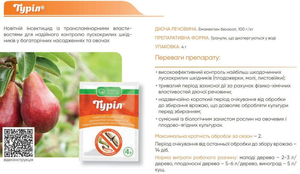 Для получения максимального результата необходимо обеспечить равномерное покрытие обрабатываемых растений. Опрыскивание против плодожорок и листоверток лучше всего проводить в начале возрождения гусениц. За счет быстрого поглощения и трансламинарных свойств (способность препарата проникать через кутикулу листа) емамектин бензоата уменьшается влияние факторов окружающей природной среды на эффективность действия препарата и минимизируется негативное влияние на энтомофагов. При соблюдении всех регламентов Турил является безопасным для птиц, млекопитающих и полезных энтомофагов, а также может сочетаться с биологической защитой. Продолжительность защитного действия препарата составляет 10-15 дней.
