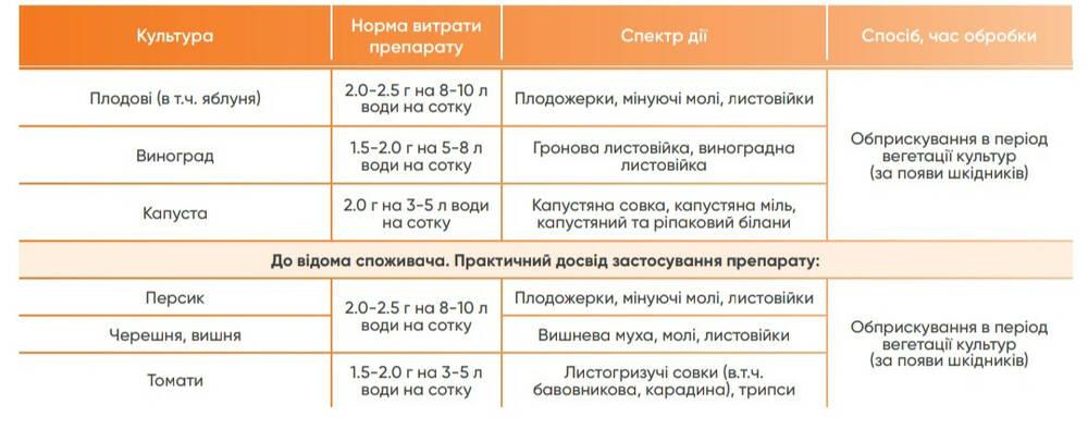 | Плодовые (в т. ч. яблоня) | 2.0-2.5 г на 8-10 л воды на сотку | Плодожорки, минирующие моли, листовертки | Опрыскивание в период вегетации культур (при появлении вредителей) |