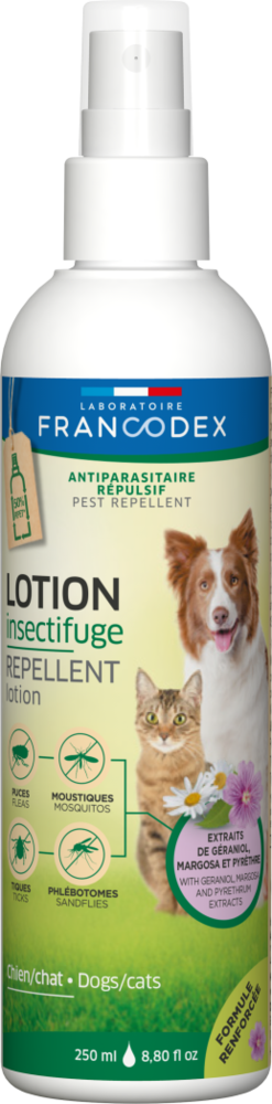Виготовлений з маргози, піретруму та екстрактів гераніолу, репелентів для комах, REPELLENT LOTION FRANCODEX захищає вашу тварину від будь-якого зараження паразитами. Ідеально підходить для тварин, яких важко купати, лосьйон не вимагає змивання. Упаковка виготовлена ​​щонайменше на 50% із переробленого пластику, щоб зменшити наш вуглецевий слід.