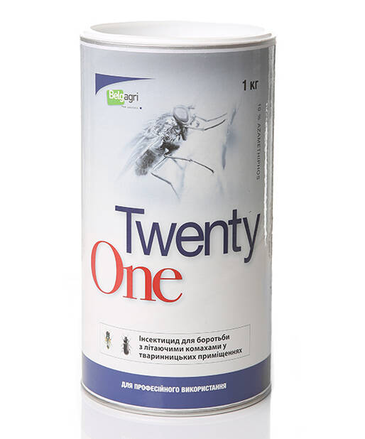 Інсектицидний препарат Twenty One, 1 кг — потужний інсектицидний засіб для знищення дорослих мух у тваринницьких та виробничих приміщеннях. Містить солодку принаду з атрактантом, яка приваблює мух до обробленої поверхні. Препарат діє при контакті або споживанні, знищуючи комах вже за кілька хвилин.