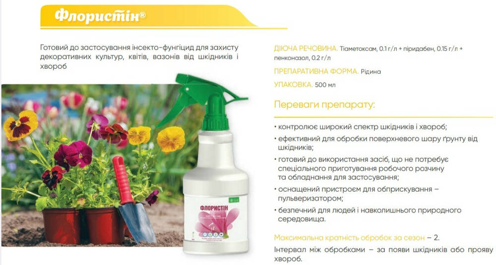 Флористин - Готовый к применению инсекто-фунгицид для защиты декоративных культур, цветов, вазонов от вредителей и болезней.