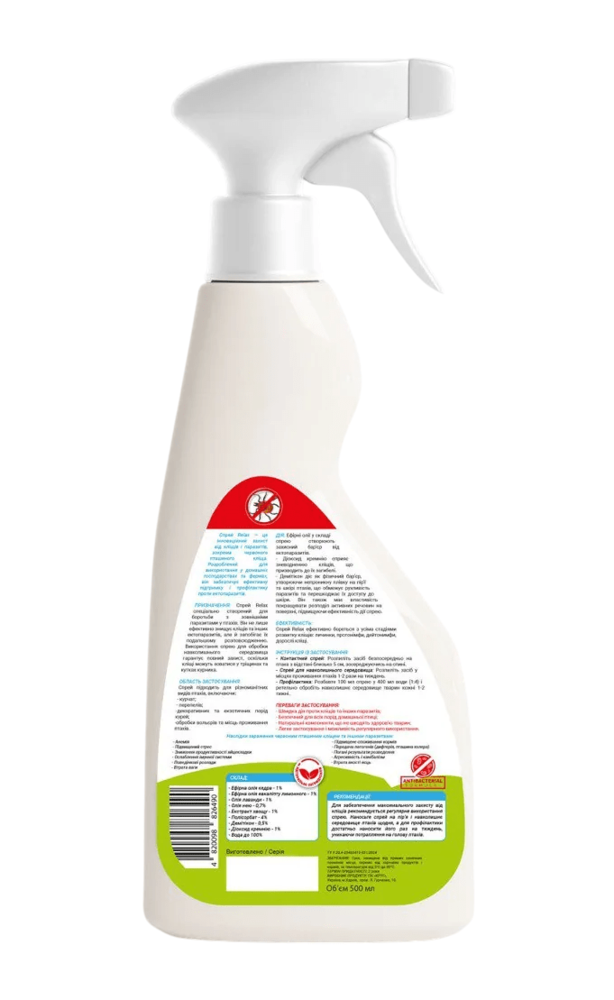 Спрей RELAX спеціально створений для боротьби з зовнішніми паразитами сільськогосподарської птиці Він не лише ефективно знищує кліщів та інших ектопаразитів, але й запобігає їх подальшому розповсюдженню. Використання спрею для обробки навколишнього середовища гарантує повний захист, оскільки кліщі можуть ховатися у тріщинах та кутках курника. Спрей RELAX ефективно бореться з кліщами на усіх стадіях розвитку: личинки, протонімфи, дейтонімфи, дорослі кліщі.