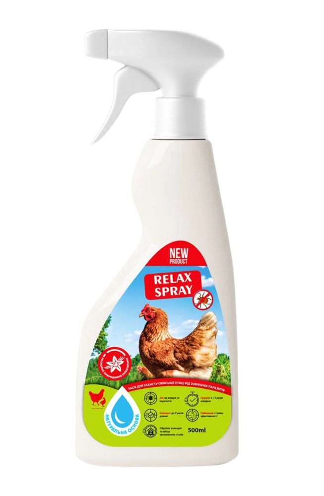 Спрей RELAX — це інноваційний захист від паразитів, зокрема червоного пташиного кліща, що забезпечить здоров’я та продуктивність птахів. Розроблений для використання у домашніх господарствах і на фермах, він забезпечує ефективне знищення та надійний профілактичний захист.