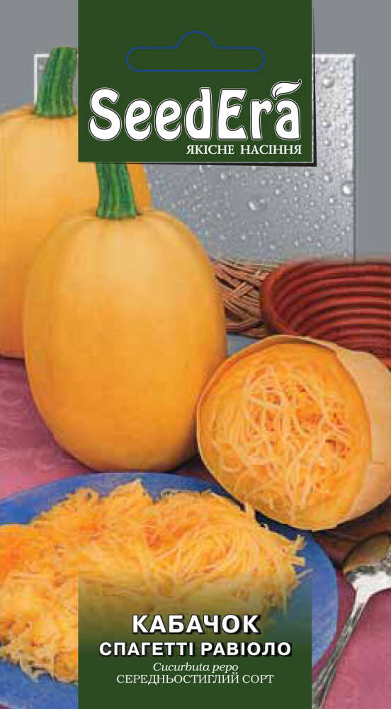Спагетті Равіоло - від сходів до першого збору плодів 70 - 90 днів. Відрізняється оригінальністю використання. Плід циліндричний, гладкий, довжиною до 30 см, біля основи слаборебристий. Забарвлення плоду в технічній стиглості білувате, в біологічній - жовте. Маса товарного плоду 0,7 - 1,2 кг. Кора тверда, м'якуш жовтий, товстий, щільний, що розпадається на волокна, малосолодкий, соковитий. Смакові якості відмінні.