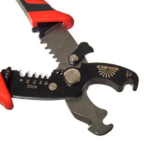Кабелеріз оснащений функцією зняття ізоляції для проводів із перерізом 1,3 – 8,0 мм², що дає змогу працювати з різними видами кабелів. Функція обтиску клем забезпечує надійне з'єднання дротів без потреби у додаткових інструментах.