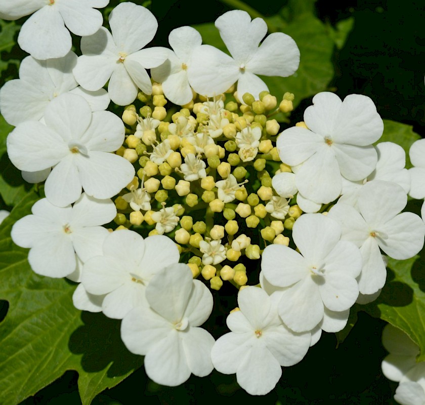 Особливо цікавими у калини є суцвіття. При поверхневому погляді на них здається, що у більшої частини квіток пелюстки вже опали, або ще не розпустилися. Придивившись же пильніше, можна помітити, що справжні квіти з тичинками і маточками розташовані тільки в центрі суцвіття. Красиві ж окраїнні квітки стерильні.