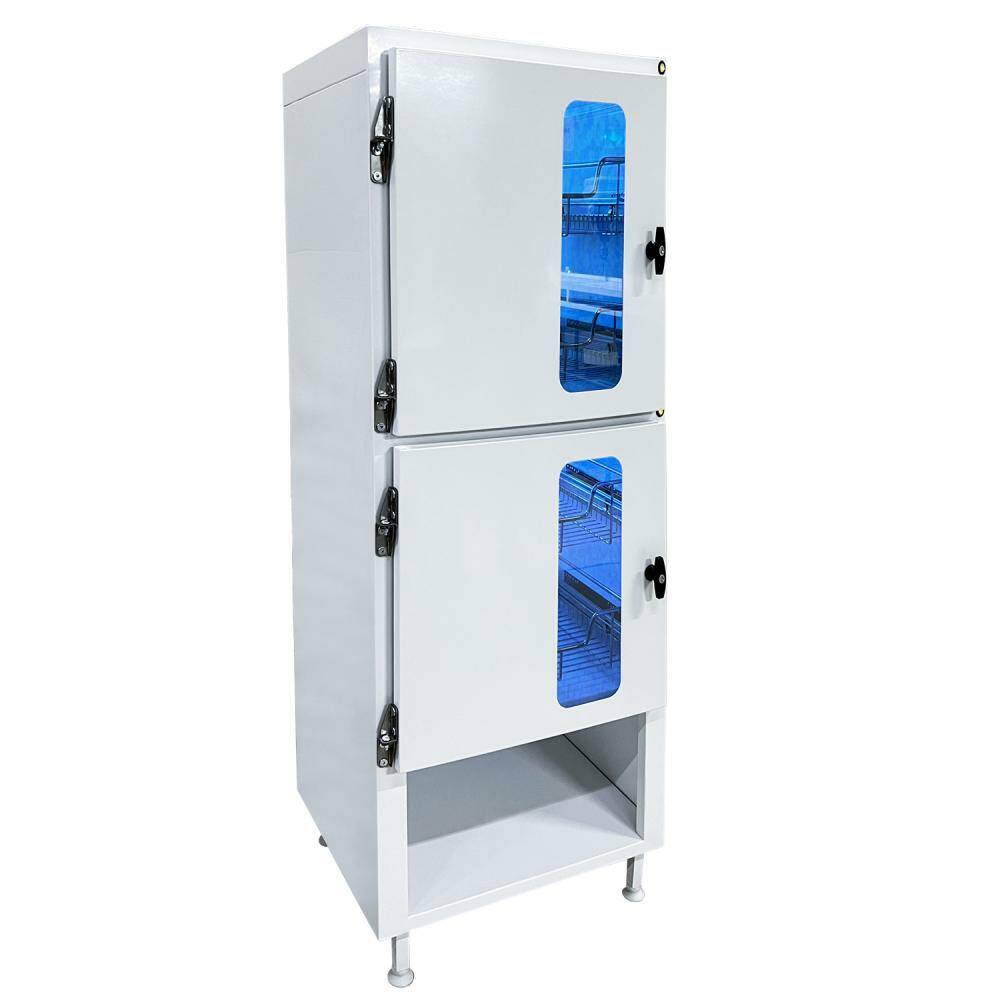 Конструкція являє собою суцільнозварний металевий корпус, що включає два незалежні УФ-бокси з індивідуальними дверцятами. Кожен бокс обладнаний бактерицидною лампою Philips TUV 15W, яка генерує ультрафіолетове випромінювання довжиною хвилі 253,7 нм для ефективного придушення життєдіяльності патогенних мікроорганізмів у повітрі та на поверхнях. Дверцята оснащені замками та скляними віконцями, які не пропускають УФ-промені, але дозволяють контролювати наявність інструментів усередині.
