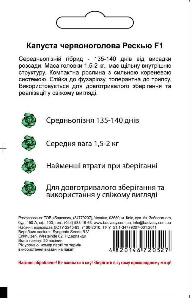 Капуста червоноголова Реск'ю F1, 20 шт, Садиба Центр