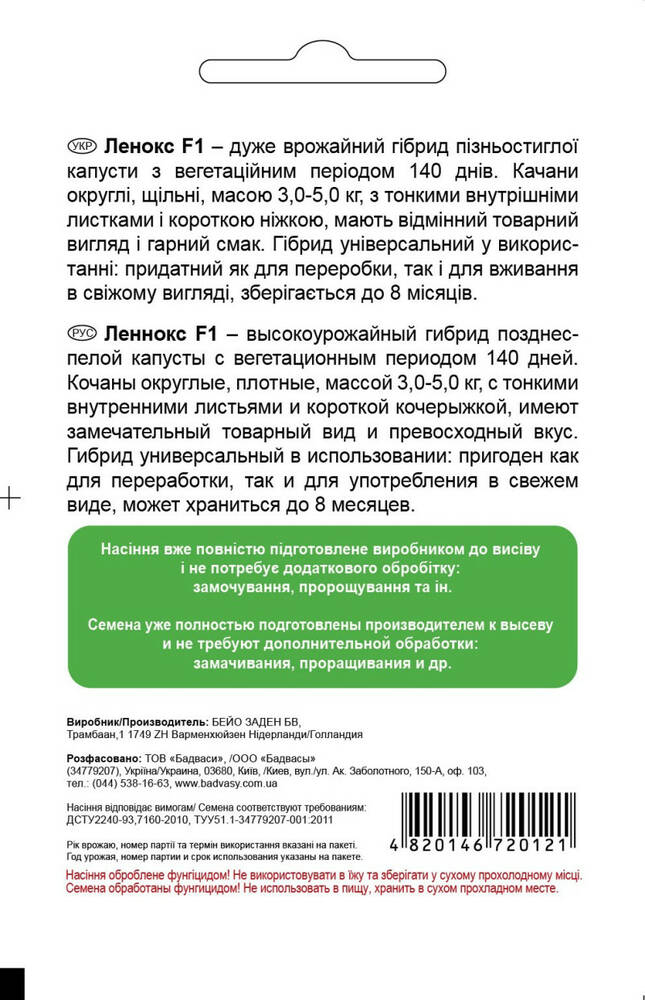 Капуста Ленокс F1, 20 шт, Садиба Центр