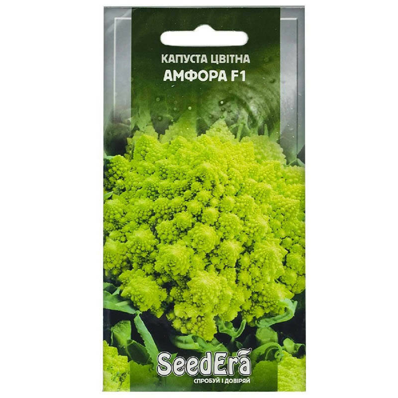Капуста цвітна Амфора F1 - ранньостиглий гібрид сортотипу Романеско. Формує куполоподібну головку жовто-зеленого кольору, масою 360-450 г. Поверхня головки сегментована, закручується по спіралі, тому виглядає дуже ефектно. Свіжий качан може зберігатися в холодильнику не більше тижня. Товарна врожайність головок 1,5 кг/м2. Цінність гібрида: скоростиглість, оригінальна забарвлення і форма головки, вирівняність. Рекомендується для використання в домашній кулінарії та для заморожування.