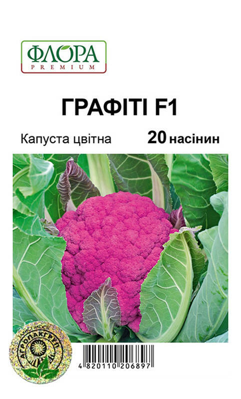 Капуста цвітна Графіті має рекордну концентрацію вітаміну С, легко засвоюється і швидко переробляється організмом. Цей сорт лідер за складом мікроелементів. Капуста цвітна сорту Графіті має велику округлу головку. Середньогорбкова, добре прикрита блакитно-сірим листям. Суцвіття щільно прилягають одна до одної. Колір плоду багряно-фіолетовий, головка вагою 1-1,5 кг. Період вегетації 100-120 днів.