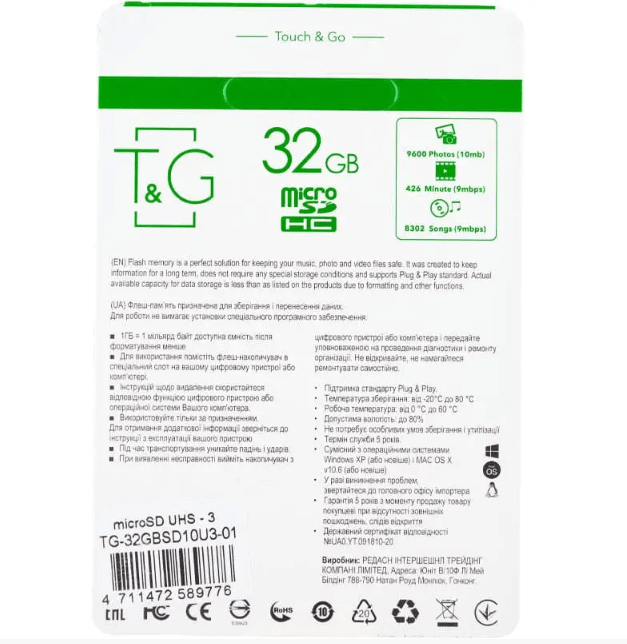 Карта пам'яті microSD 32 Гб T&G з адаптером UHS-I class 10 сумісна з усіма пристроями для читання та запису флеш-карт стандарту microSD, такими як мобільні телефони, комунікатори, MP3-плеєри тощо.