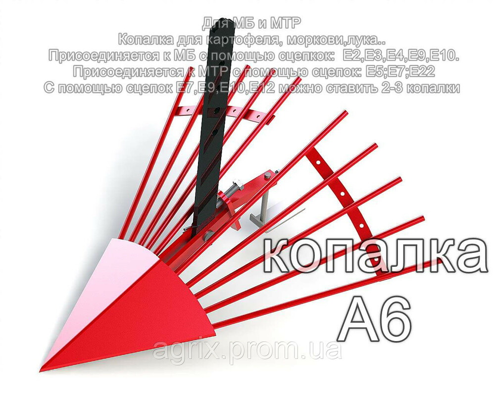 Присоединяется к Мотоблоку с помощью сцепкок: Е2,Е3,Е4,Е9,Е10.