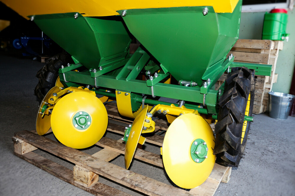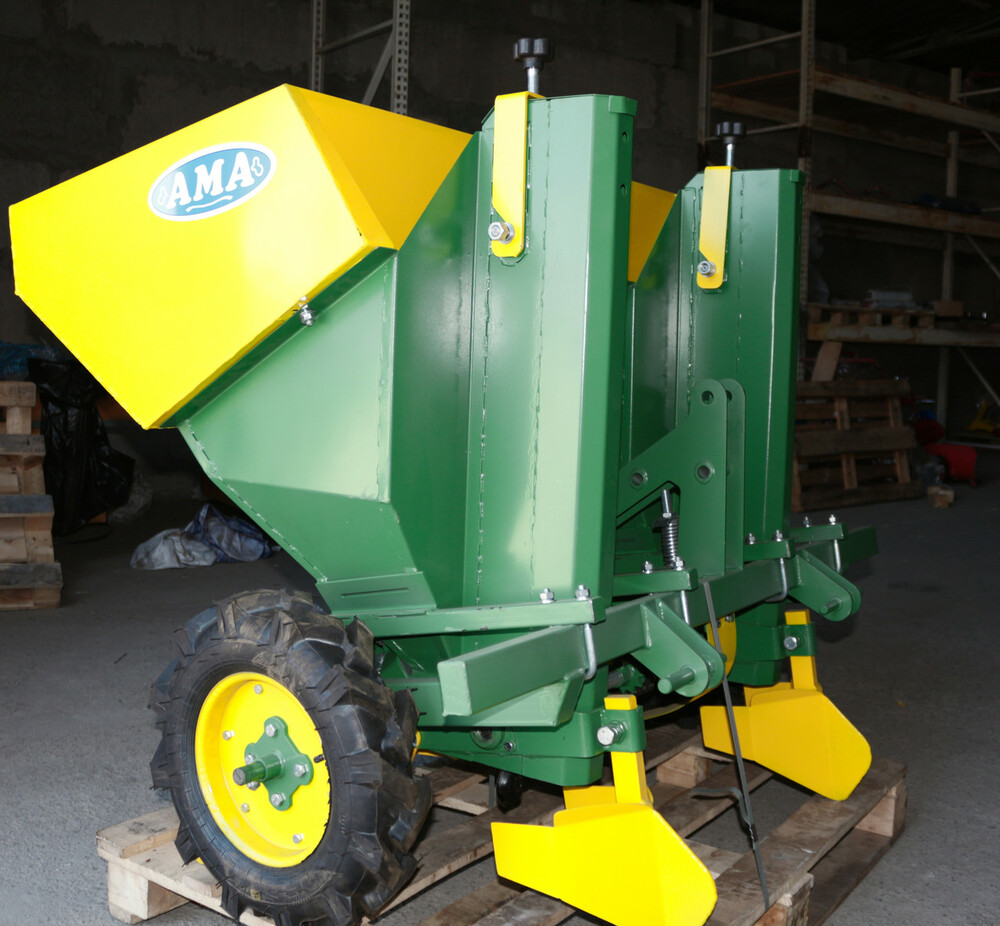 Картофелесажалка АМА В2. Двухрядная картофелесажалка. Междурядье = 55-65 см. Шаг посадки = 18-22-26-30 см., Глубина посадки = 10-15 см., Объем бункера = 450 литров, Расстояние между колесами = 116-125 см.