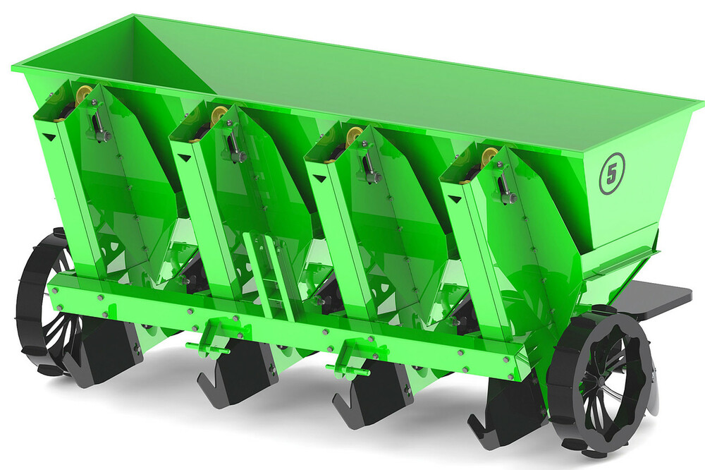 Картофелесажалка четырех рядная КС-4 с бункером на 1000 литров. Картофелесажалка четырехрядная КС-4 - разработанная для высадки картофеля с помощью трактора от 35 л.с. Четырехрядная картофелесажалка КС-4 имеет возможность регулировать шаг высева на 24-27-31 см. И регулировку междурядий от 60 до 75 см.