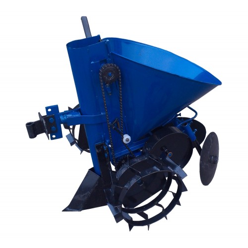 Картоплесаджалка мотоблочна К-1Л — надійний і зручний помічник для посадки картоплі в один ряд. Має регулювання відстані між бульбами, глибини посадки і висоти гребеня. Привід обертання для посадки картоплі здійснюється через ланцюг від ґрунтозацепів. Ложечки для укладання картоплі розташовані на міцній стрічці.