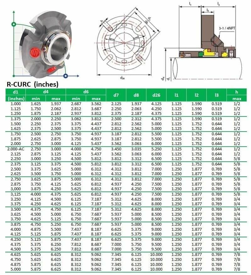 R-CURC – одинарне картриджне ущільнення, гідравлічно розвантажене, з підпружиненою частиною, що обертається, не залежить від напрямку обертання валу. Конструкція включає: графітне дросельне кільце, канали для підведення і зливу охолоджувальної рідини, пружини які не контактують з продуктом. Доступні такі модифікації ущільнення: