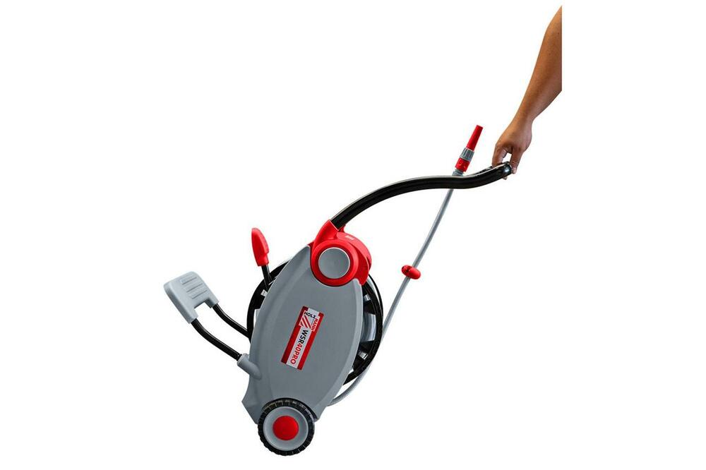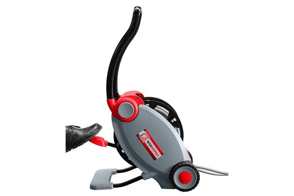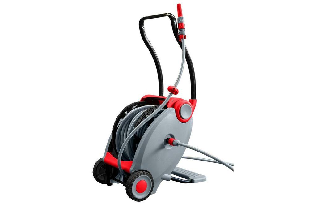 . ОСОБЕННОСТИ: компактная катушка со шлангом длиной 40 м.; прочный пластиковый корпус; складная ручка для удобства эксплуатации и компактности; механизм закатки с помощью ножной педали; 2 колеса облегчают транспортировку; кронштейн для крепления шланга; высокая стабильность и устойчивость благодаря основанию.