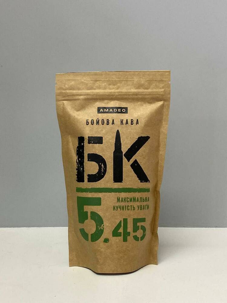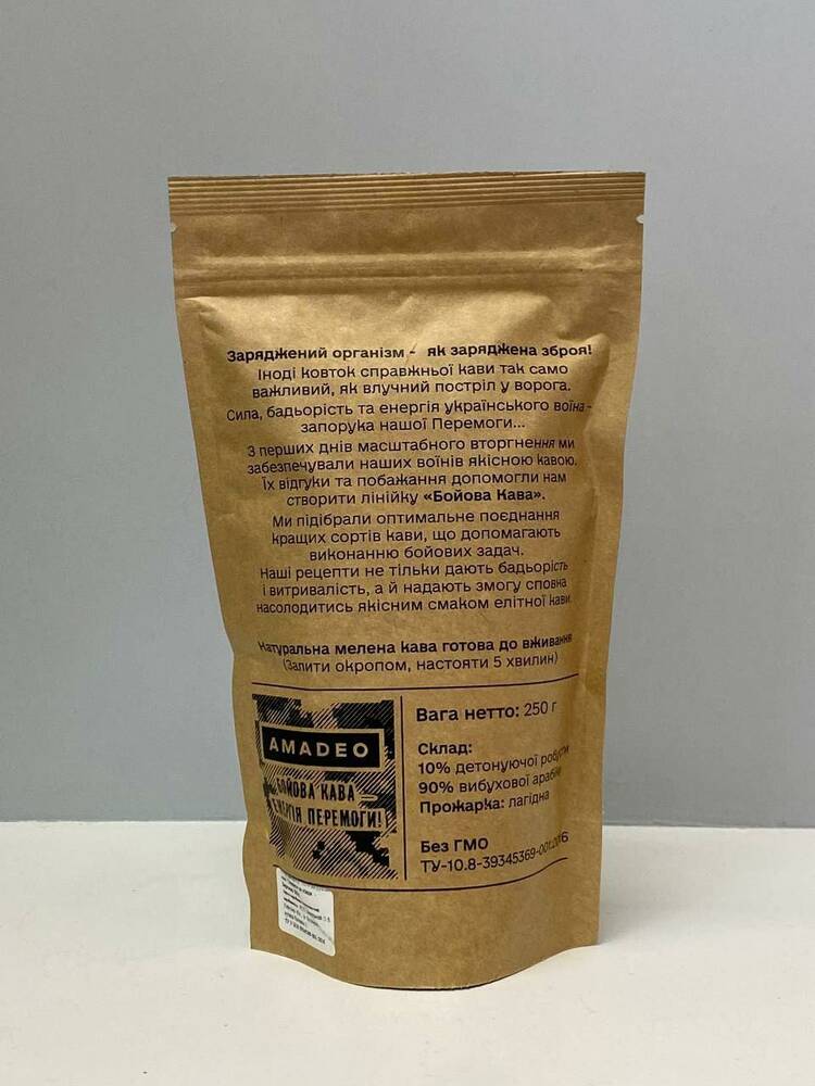 Кава мелена "БК 5.45" (БОЙОВА КАВА) Amadeo упаковка 250 г свіжообсмажена, 10% робусти, 90% арабіки, дрібний помол,  лагідне обсмаження, для приготування в турці, гейзерній кавоварці. Аромат тонкий, збалансований. Невеличка кислинка, міцна, нотки темного шоколаду