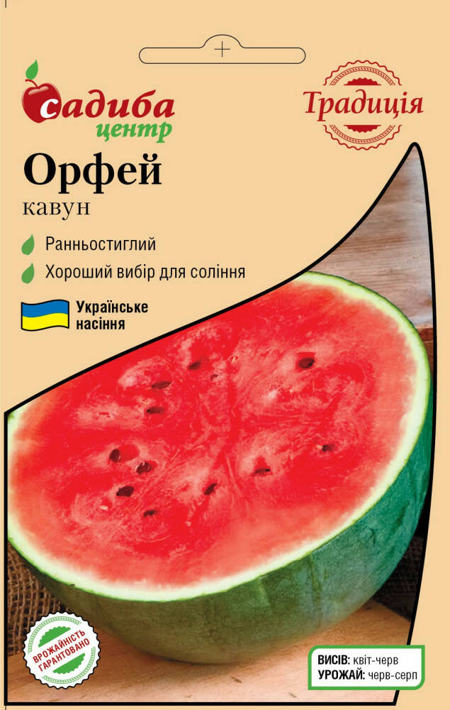 Орфей - плоди округлі, темно - зеленого кольору, шкірка гладенька. М'якоть приємного малинового кольору, зерниста, солодка та соковита. Рослина середньоплетиста, добре переносить засуху. Хороший вибір для споживання у свіжому вигляді та соління.