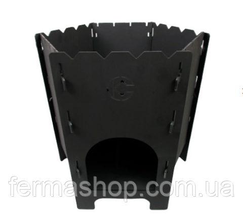 Конструкция разбирается на 8 элементов: 6 секций, которые составляют основу в виде шестигранника; 2 пластины (перекладины) - для закладки дров/углей.