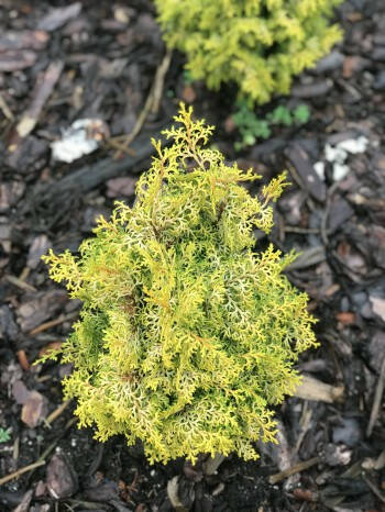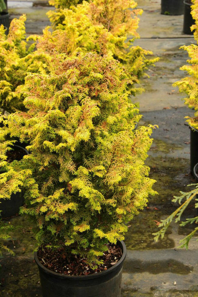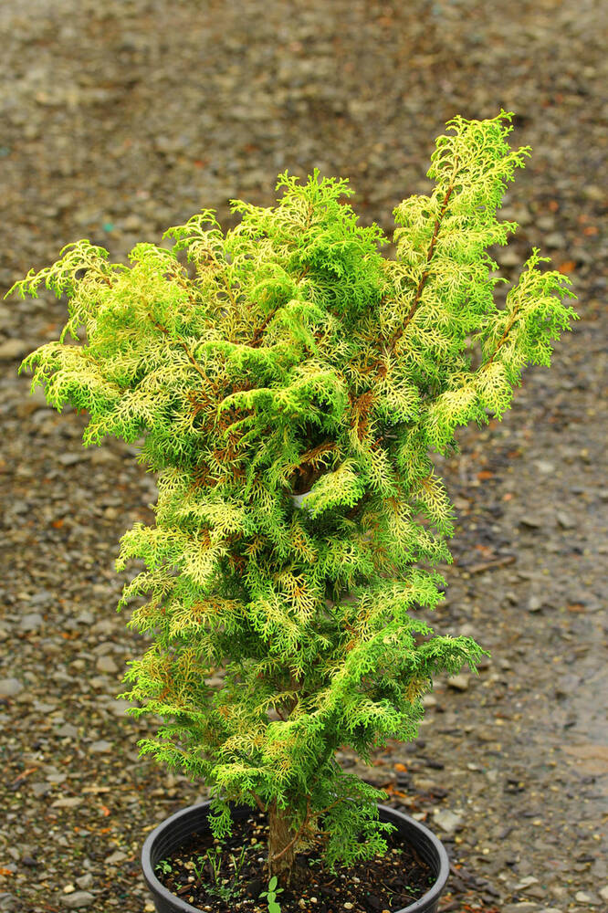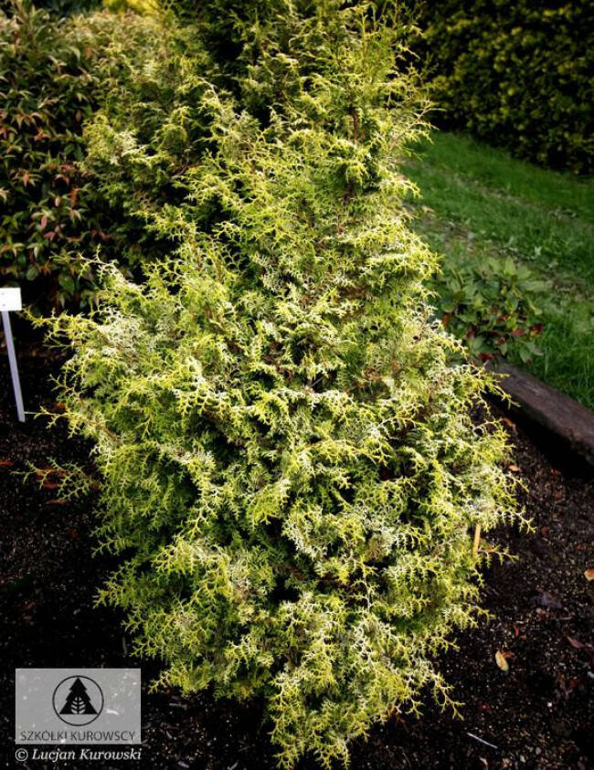 Вічнозелене деревце з ажурною хвоєю оригінального забарвлення. Гілки спрямовані догори, щільно розташовані, створюючи колоноподібну форму. Хвоя має ажурну структуру. Пофарбована вона у жовто-лимонно-лаймові кольори.