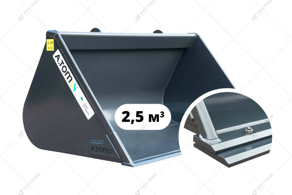 Ківш для зерна зі змінним ножем А.ТОМ 2,5 м³ ⭐ Об'єм - 2,5 м³. ✅ Ширина - 2450 мм. Висота - 1210 мм. Глибина - 1854 мм. Вага - 542 кг.