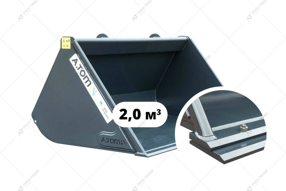 Ківш зі змінним ножем А.ТОМ 2,0 м³ Evolution, ножі Hardox сумісний з навантажувачами JCB, Manitou, Dieci, Bobсat, New Holland, Claas, Merlo, Dieci, Faresin. Використовується для виконання широкого спектру завдань. Він застосовується для: навантаження та розвантаження різноманітних матеріалів, таких як ґрунт, пісок, каміння, щебінь, будівельні матеріали та інші вантажі; виїмки ґрунту при будівництві котлованів, ям, траншей та інших обʼєктів; укладання ґрунту для створення рівних поверхонь перед подальшими будівельними роботами; збирання будівельного сміття, рециклінгу відходів, переробки сипучих матеріалів, сортування матеріалів на складах. Він має посилену конструкцію, що дозволяє витримувати інтенсивні навантаження та більш тривалу експлуатацію без пошкоджень та зношення, а також за рахунок збільшеної міцності та можливості роботи з важкими матеріалами, забезпечує швидше та ефективніше виконання поставлених завдань.