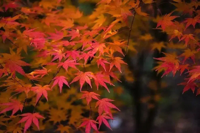 Листя з'являються навесні жовто-зеленими з оранжево-тонованими краями. Літом вони яскраво-зеленого кольору, а їх облямівка – стає розовою. І, нарешті, восени - вони набувають пастельних відтінків оранжевого та жовтого кольору. Маленькі, пальчасті, 5-лопатеві листки до 2,5 см завдовжки.