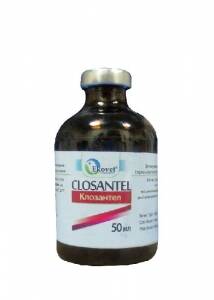 Клозан 5% Опис Прозорий густий розчин жовтого кольору. Склад 1 мл препарату містить: клозантел 50 мг; Фармакологічні властивості ATCvet QP52A, протитрематодні, протинематодні і протицестодні ветеринарні препарати (QP52AG09, клозантел). Діюча речовина препарату - клозантел, протипаразитарний засіб, структурно похідний саліциланілідів, що має довготривалу дію на ендо- та ектопаразитів. Клозантел блокує процес фосфорилювання (утворення АТФ) в організмі паразитів через втручання у процеси транспортування електронів, змінюючи енергетичний метаболізм, що призводить до загибелі паразитів. Клозантел має широкий діапазон дії, ефективний у лікуванні паразитарних захворювань великої та дрібної рогатої худоби , викликаних нематодами, трематодами та членистоногими. Клозантел швидко всмоктується при пероральному або внутрішньом'язовому введенні. Максимальна концентрація його у крові овець досягається через 8-24 години після введення, у крові великої рогатої худоби - через 24-48 годин. Період напіввиведення становить приблизно 12-15 діб. Найбільше клозантал концентрується у легенях і нирках, а основним шляхом його метаболізму є відновлювальна деіонізація. Застосування Профілактика та лікування у великої та дрібної рогатої худоби наступних захворювань: велика рогата худоба: - фасціольоз (Fasciola hepatica, статевозрілі та пізні личинкові форми); - нематодози (дорослі та личинкові форми Bunostomum spp., Haemonchus сontortus, Haemonchus placei та Oesophagostomum radiatum); - гіподермози, спричинені личинками підшкірного овода Hypoderma spp.; вівці,кози: - фасціольоз (Fasciola hepatica, статевозрілі та пізні личинкові форми); - нематодози (дорослі та личинкові форми Bunostomum spp., Haemonchus сontortus, Haemonchus placei та Oesophagostomum radiatum, Chabertia ovina); - естроз (Oestrosis ovis). Дозування Препарат вводиться підшкірно одноразово у наступних дозах: 0,5 мл /10кг м.т., при фасціольозі 1 мл /10 кг м.т. Рекомендується при введенні препарату дозу розділити навпіл і ввести у різні місця. Протипоказання Не застосовувати одночасно з протипаразитарними хлорорганічними препаратами. Забороняється застосовувати дійним коровам та вагітним самкам у останній триместр вагітності. Застереження Забій тварин на м'ясо дозволяється через 28 діб, використання молока для харчування людей - через 14 діб після застосування препарату. На місці введення препарату можливе незначне запалення, яке зникає самостійно через дві - три доби після введення. Деякі породи великої рогатої худоби (шароле та її гібриди) є особливо чутливими до препарату, приблизно у 2 % тварин після введення препарату спостерігалися анафілактичні реакції. Форма випуску Флакони склянні по 10, 50, 100 та 250 мл. Зберігання Зберігати у сухому прохолодному, захищеному від світла місці за температури від 5 до 25°С. Термін придатності - 2 роки з дати виготовлення. Аналог Клозантел, Бронтел, Роленол