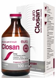Клозан 5% Опис Прозорий густий розчин жовтого кольору. Склад 1 мл препарату містить: клозантел 50 мг; Фармакологічні властивості ATCvet QP52A, протитрематодні, протинематодні і протицестодні ветеринарні препарати (QP52AG09, клозантел). Діюча речовина препарату - клозантел, протипаразитарний засіб, структурно похідний саліциланілідів, що має довготривалу дію на ендо- та ектопаразитів. Клозантел блокує процес фосфорилювання (утворення АТФ) в організмі паразитів через втручання у процеси транспортування електронів, змінюючи енергетичний метаболізм, що призводить до загибелі паразитів. Клозантел має широкий діапазон дії, ефективний у лікуванні паразитарних захворювань великої та дрібної рогатої худоби , викликаних нематодами, трематодами та членистоногими. Клозантел швидко всмоктується при пероральному або внутрішньом'язовому введенні. Максимальна концентрація його у крові овець досягається через 8-24 години після введення, у крові великої рогатої худоби - через 24-48 годин. Період напіввиведення становить приблизно 12-15 діб. Найбільше клозантал концентрується у легенях і нирках, а основним шляхом його метаболізму є відновлювальна деіонізація. Застосування Профілактика та лікування у великої та дрібної рогатої худоби наступних захворювань: велика рогата худоба: - фасціольоз (Fasciola hepatica, статевозрілі та пізні личинкові форми); - нематодози (дорослі та личинкові форми Bunostomum spp., Haemonchus сontortus, Haemonchus placei та Oesophagostomum radiatum); - гіподермози, спричинені личинками підшкірного овода Hypoderma spp.; вівці,кози: - фасціольоз (Fasciola hepatica, статевозрілі та пізні личинкові форми); - нематодози (дорослі та личинкові форми Bunostomum spp., Haemonchus сontortus, Haemonchus placei та Oesophagostomum radiatum, Chabertia ovina); - естроз (Oestrosis ovis). Дозування Препарат вводиться підшкірно одноразово у наступних дозах: 0,5 мл /10кг м.т., при фасціольозі 1 мл /10 кг м.т. Рекомендується при введенні препарату дозу розділити навпіл і ввести у різні місця. Протипоказання Не застосовувати одночасно з протипаразитарними хлорорганічними препаратами. Забороняється застосовувати дійним коровам та вагітним самкам у останній триместр вагітності. Застереження Забій тварин на м'ясо дозволяється через 28 діб, використання молока для харчування людей - через 14 діб після застосування препарату. На місці введення препарату можливе незначне запалення, яке зникає самостійно через дві - три доби після введення. Деякі породи великої рогатої худоби (шароле та її гібриди) є особливо чутливими до препарату, приблизно у 2 % тварин після введення препарату спостерігалися анафілактичні реакції. Форма випуску Флакони склянні по 10, 50, 100 та 250 мл. Зберігання Зберігати у сухому прохолодному, захищеному від світла місці за температури від 5 до 25°С. Термін придатності - 2 роки з дати виготовлення. Аналог Клозантел, Бронтел, Роленол